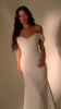 Featuring a dramatically draped silk crepe Bardot neckline, this wedding dress exudes refined elegance. Delicate pearl beading highlights the natural waist and flows seamlessly into a sleek sheath skirt, creating a sophisticated and timeless silhouette. Ideal for the modern bride with a taste for understated luxury.