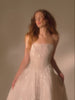 Designed with a slight sweetheart neckline, this wedding dress is a stunning blend of mixed-media beadwork and threadwork, creating dynamic movement and captivating detail. 3D petals are delicately scattered throughout the A-line skirt, adding depth and a whimsical touch to this enchanting gown.