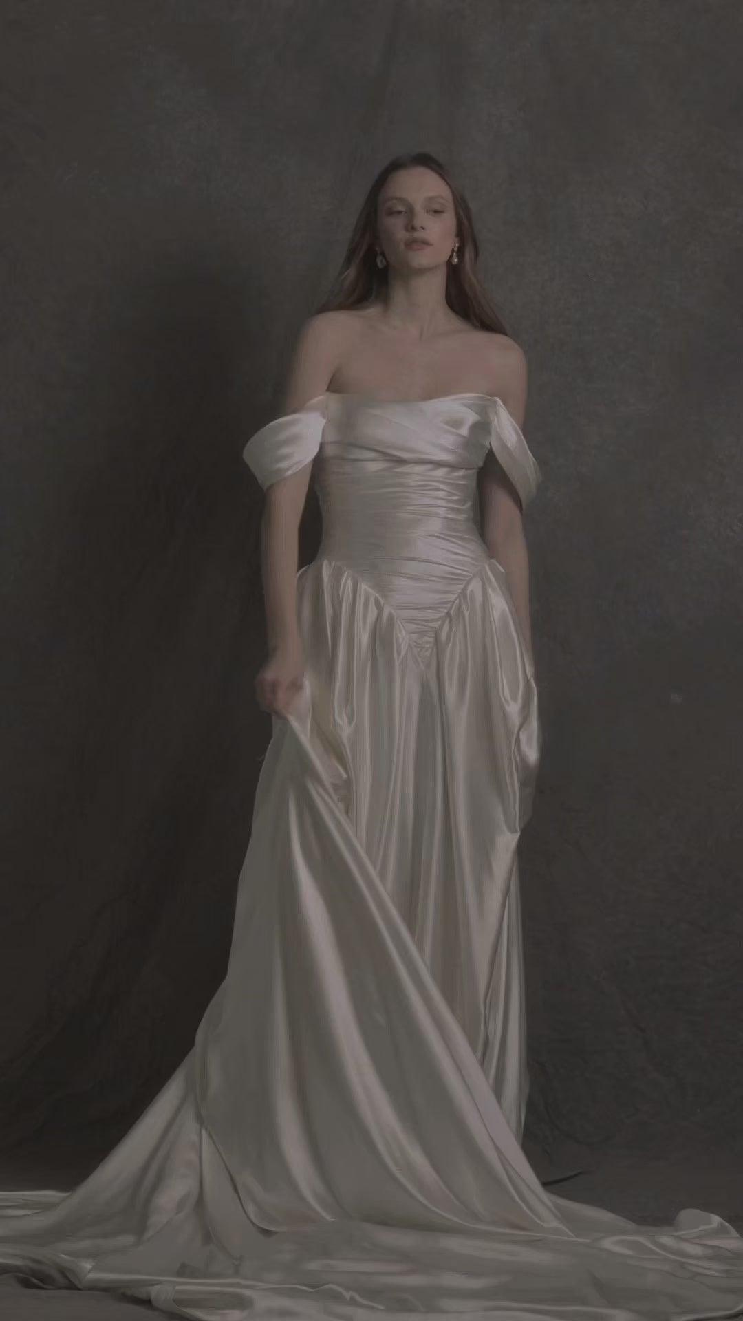 Sculptural and seductive, this gown is crafted from luxurious silk satin back crepe, designed to drape the body with an effortlessly regal fluidity. The off-the-shoulder neckline features softly folded satin that hugs the arms and frames the décolletage, adding a touch of romantic elegance. Exquisite draping along the bodice flatters the figure while the voluminous gathered skirt brings graceful movement and dimension. With its lustrous finish and refined construction, this gown offers a striking blend of sophistication and feminine allure.