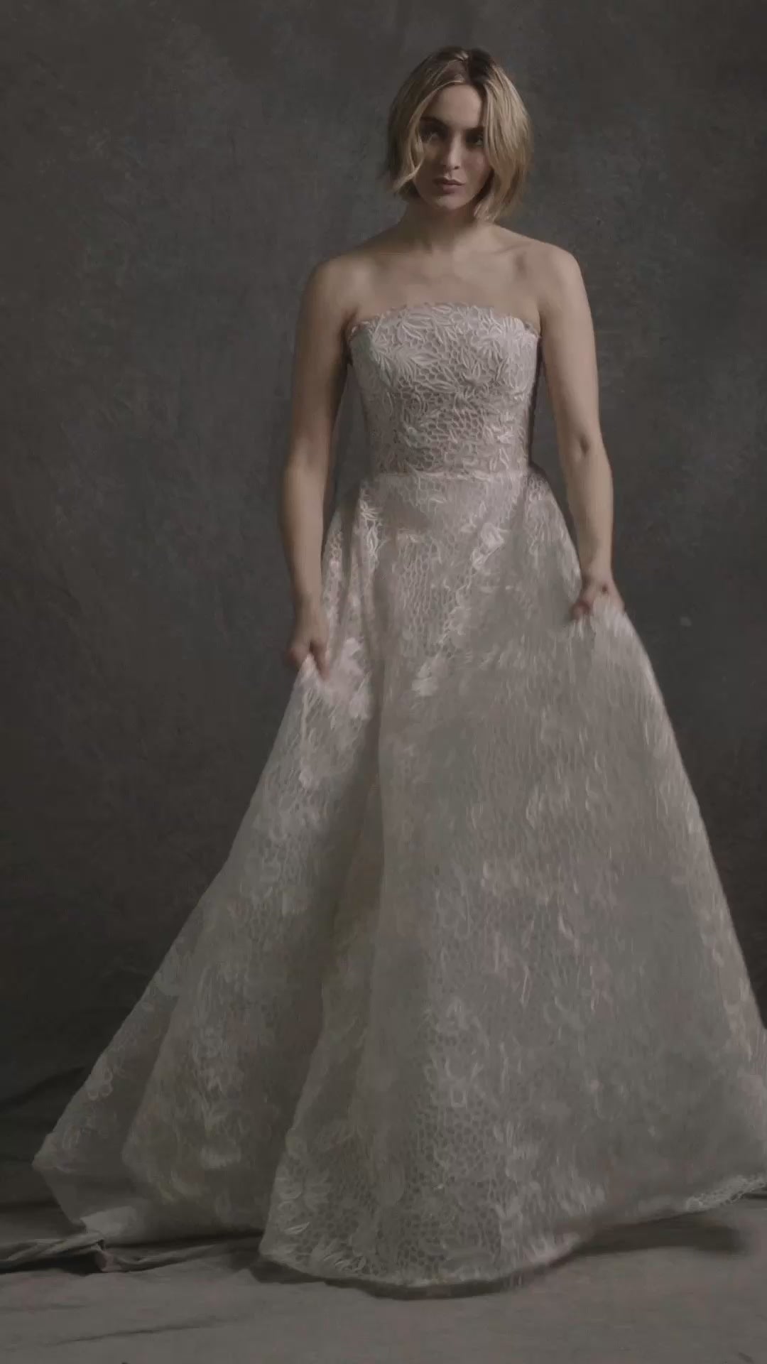 A true statement of craftsmanship, this romantic gown features a full A-line skirt and a strapless neckline, crafted entirely with hand-cut embroidery designed to mimic the intricate beauty of lace. Each floral motif is delicately placed over a honeycomb-like base, creating a textured, airy effect that adds depth without weight. The voluminous skirt moves gracefully with every step, offering drama and lightness in equal measure. Perfect for the bride who dreams of a modern fairytale look with artisanal detail.