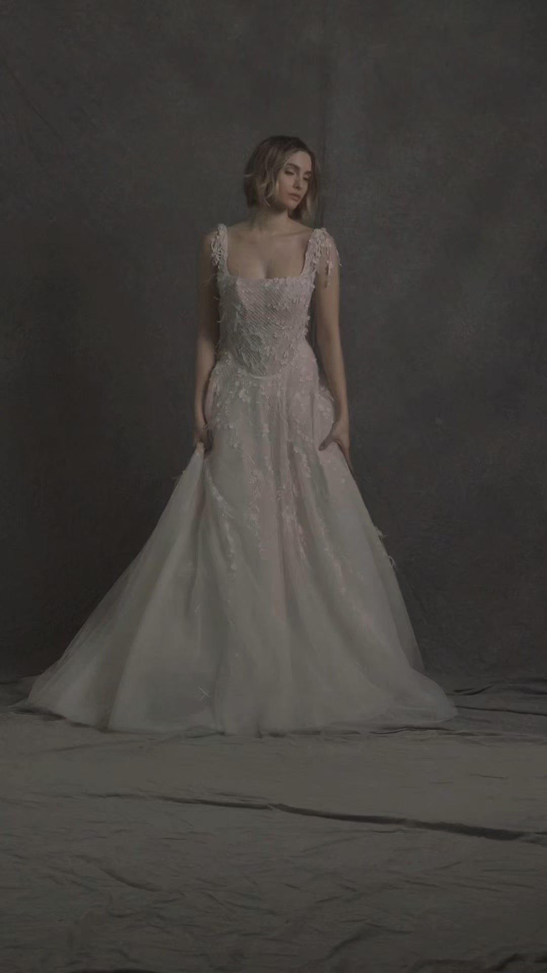 Romantic and ethereal, this gown is crafted from soft tulle and adorned with delicate hand beading and airy feather accents. The structured square neckline adds a touch of modern elegance, beautifully framing the décolletage. The bodice features a subtle latticework of shimmering threads, intricately embroidered with three-dimensional floral appliqués and micro-seed beads that catch the light with every movement. Feather-light textures cascade from the shoulders and skirt, creating a dreamlike silhouette full of whimsy and grace—perfect for the bride seeking a look that’s both feminine and fashion-forward.