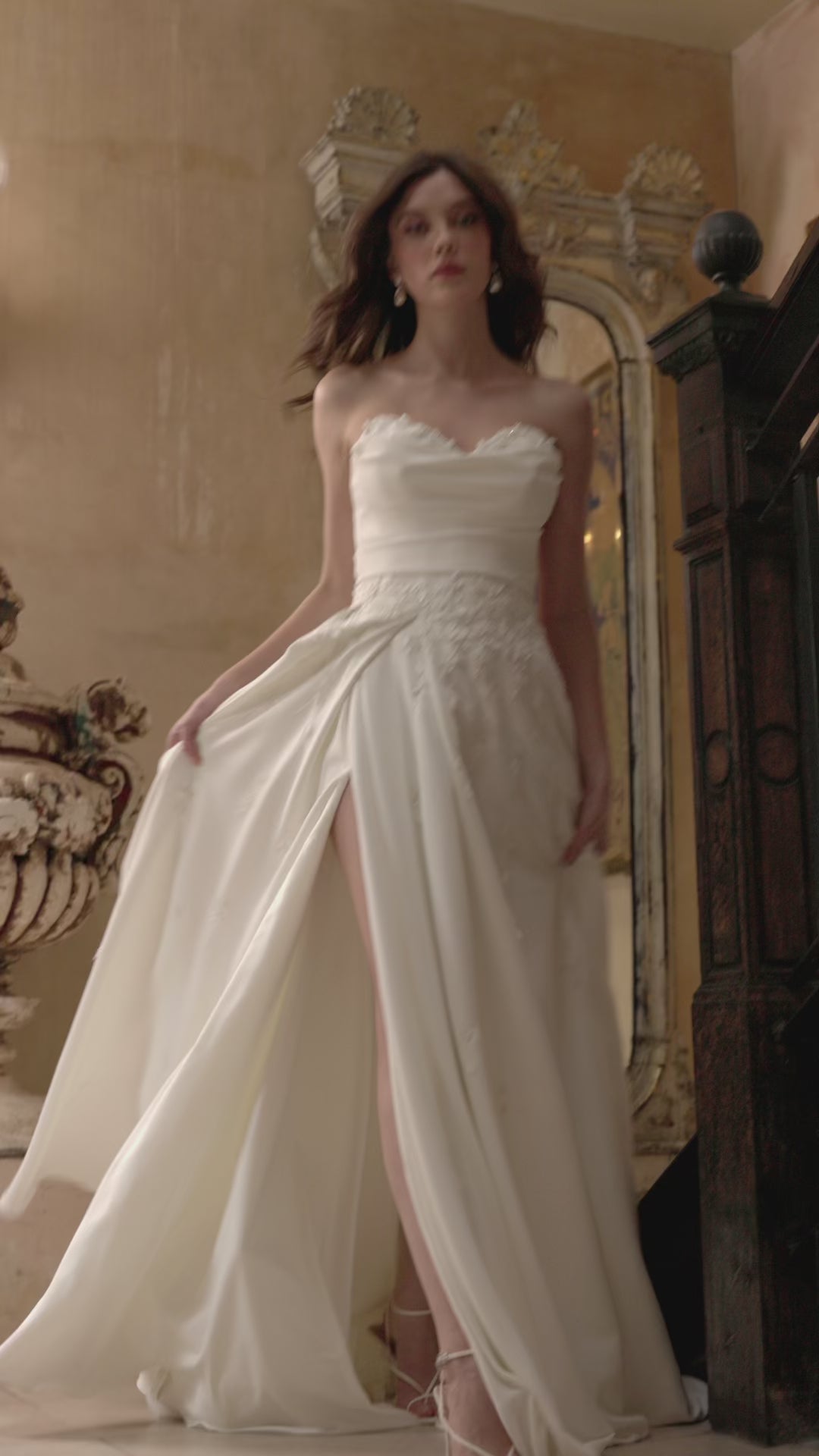 A classic and elegant choice for a bride on her big day, this crepe wedding dress has a fitted bodice that flows into an A-line flared skirt. The bodice of the dress is draped, creating a soft and romantic look that adds a touch of sophistication to the overall design. The dress features a sweetheart neckline with delicate peekaboo beading, which adds a touch of sparkle and glamour to the look. The embroidery begins at the neckline and cascades down onto the skirt, creating a beautiful and intricate design that adds depth and texture to the dress.