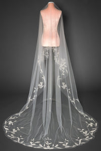 Modern structure meets timeless artistry in this striking gown, crafted from rich double-face satin for a luminous, sculptural finish. The clean strapless neckline is complemented by a dramatic draped overlay that adds dimension and softness. A dropped waist transitions into a pleated skirt, creating an effortlessly regal silhouette. Delicate French knot embroidery forms subtle botanical motifs across the bodice, gracefully cascading onto the draped overlay for a seamless, organic flow of texture. A refined choice for the bride drawn to architectural elegance and heirloom craftsmanship.