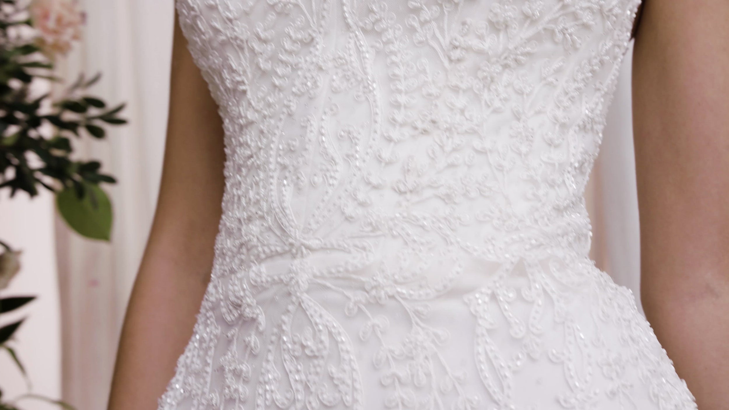 As ornate and intricate as a work of art, the Dion is a strapless, slinky trumpet gown with unbelievably exquisite beadwork. Sewn by hand to mimic the look of ivory lace, the gown is adorned from the sweetheart neckline to the hem of the chapel train in expertly placed vines, leaves, and flourishes dripping in sparkly seed beads and lustrous pearls.