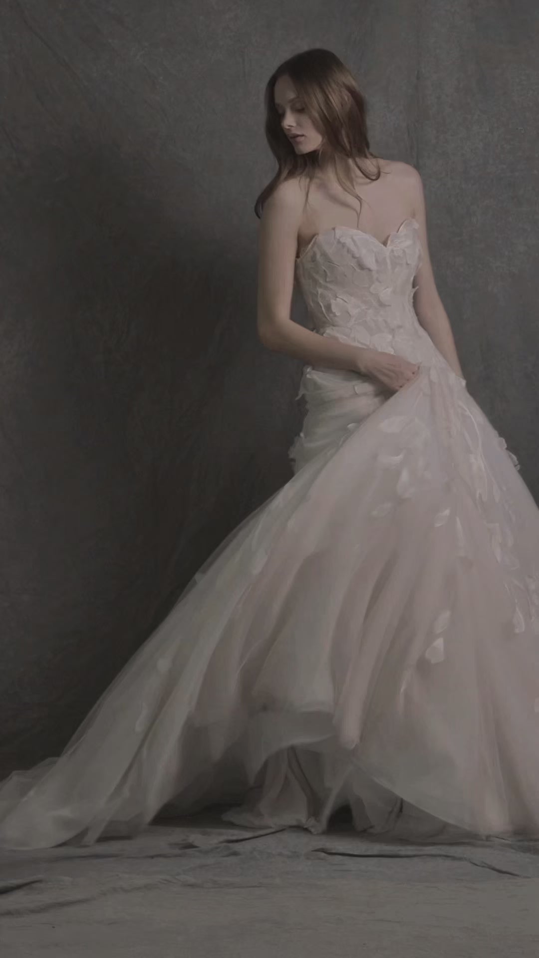 Romantic and sculptural, this gown is crafted from soft tulle and features a flattering sweetheart neckline that enhances the décolletage with timeless allure. The bodice and skirt are adorned with dimensional, hand-applied 3D appliqués—each botanical motif delicately embroidered and layered with subtle threadwork to create the illusion of florals blooming across the gown. The organic placement of the appliqués gives the design a natural, almost ethereal movement, as if the dress were kissed by a gentle breeze. A perfect choice for the bride who wants to feel both graceful and unforgettable.
