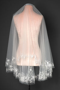 Sculptural and sensual, this gown is crafted from luminous silk satin back crepe, offering a fluid drape and a rich, polished finish. The corset-inspired bodice features a flattering demi cup structure and is delicately embroidered with tonal floral motifs for a soft, romantic touch. A draped skirt gently gathers at the hip, creating graceful movement and a modern asymmetry that flatters the figure. Perfect for the bride seeking a balance of tailored elegance and effortless glamour.