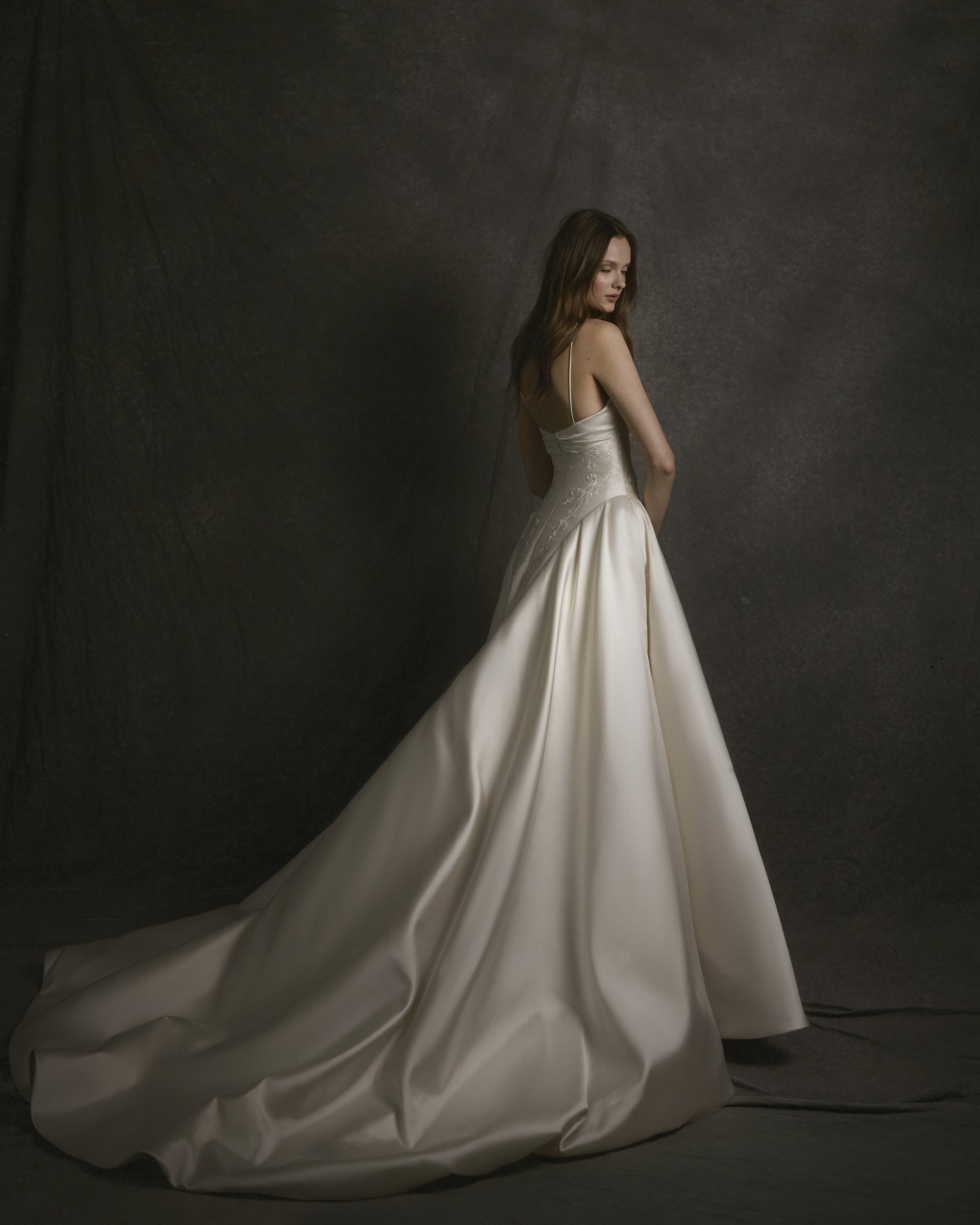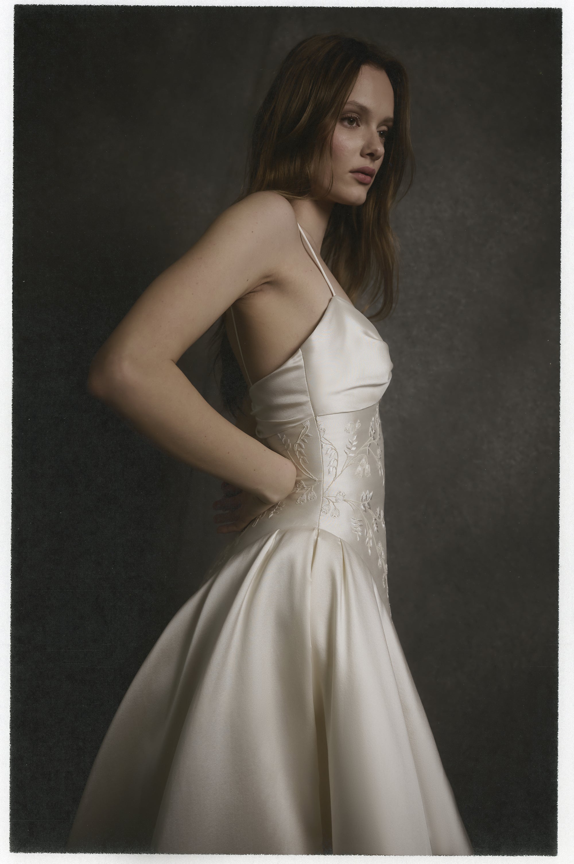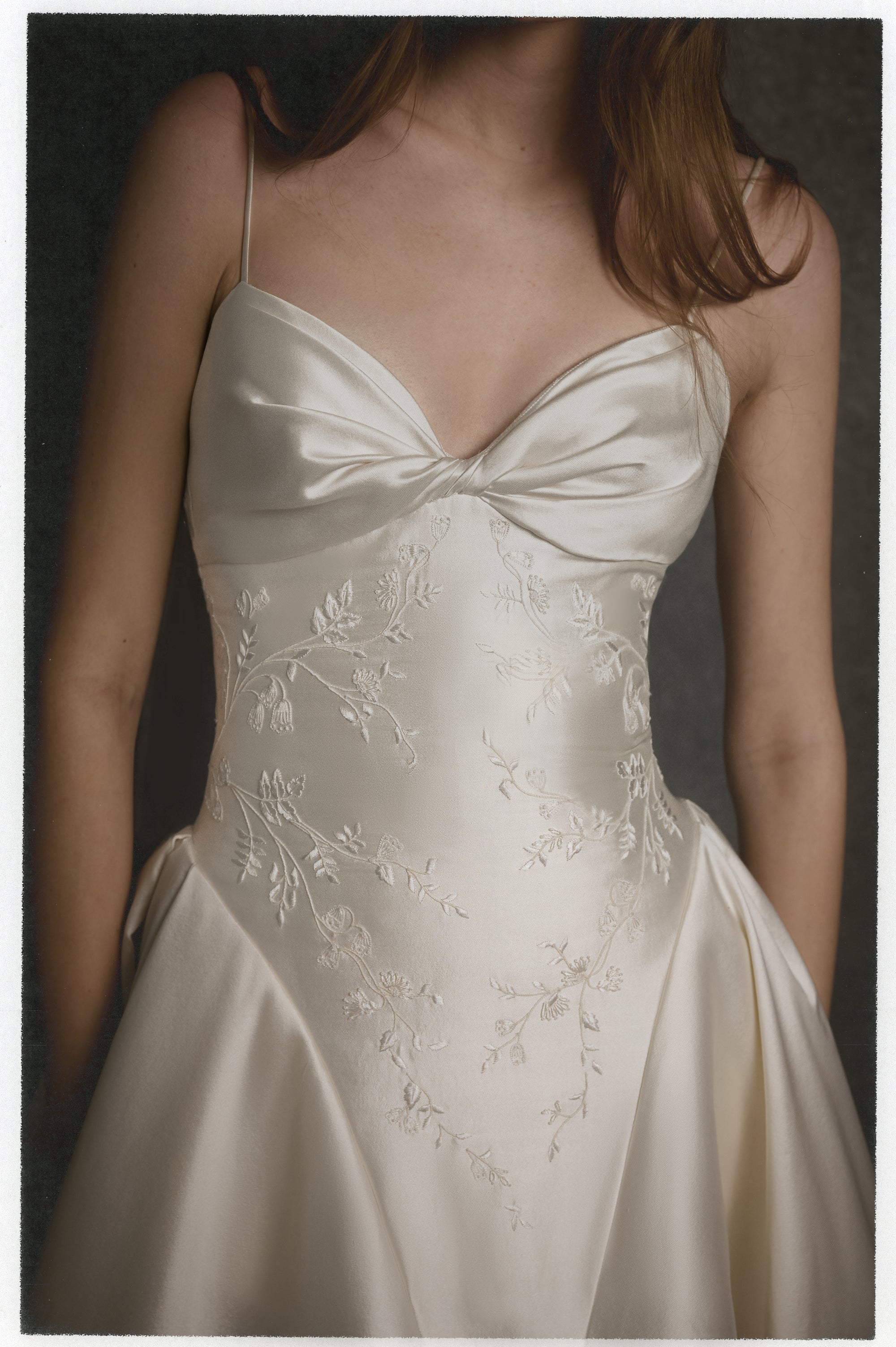 Timeless and modern, this silk wool ball gown features a sculpted bodice with delicate spaghetti straps and a romantic sweetheart neckline accented by a subtle knot detail. Soft floral embroidery at the waist adds texture, while the luminous skirt flows into a voluminous silhouette with a graceful train. A perfect balance of classic romance and contemporary elegance.