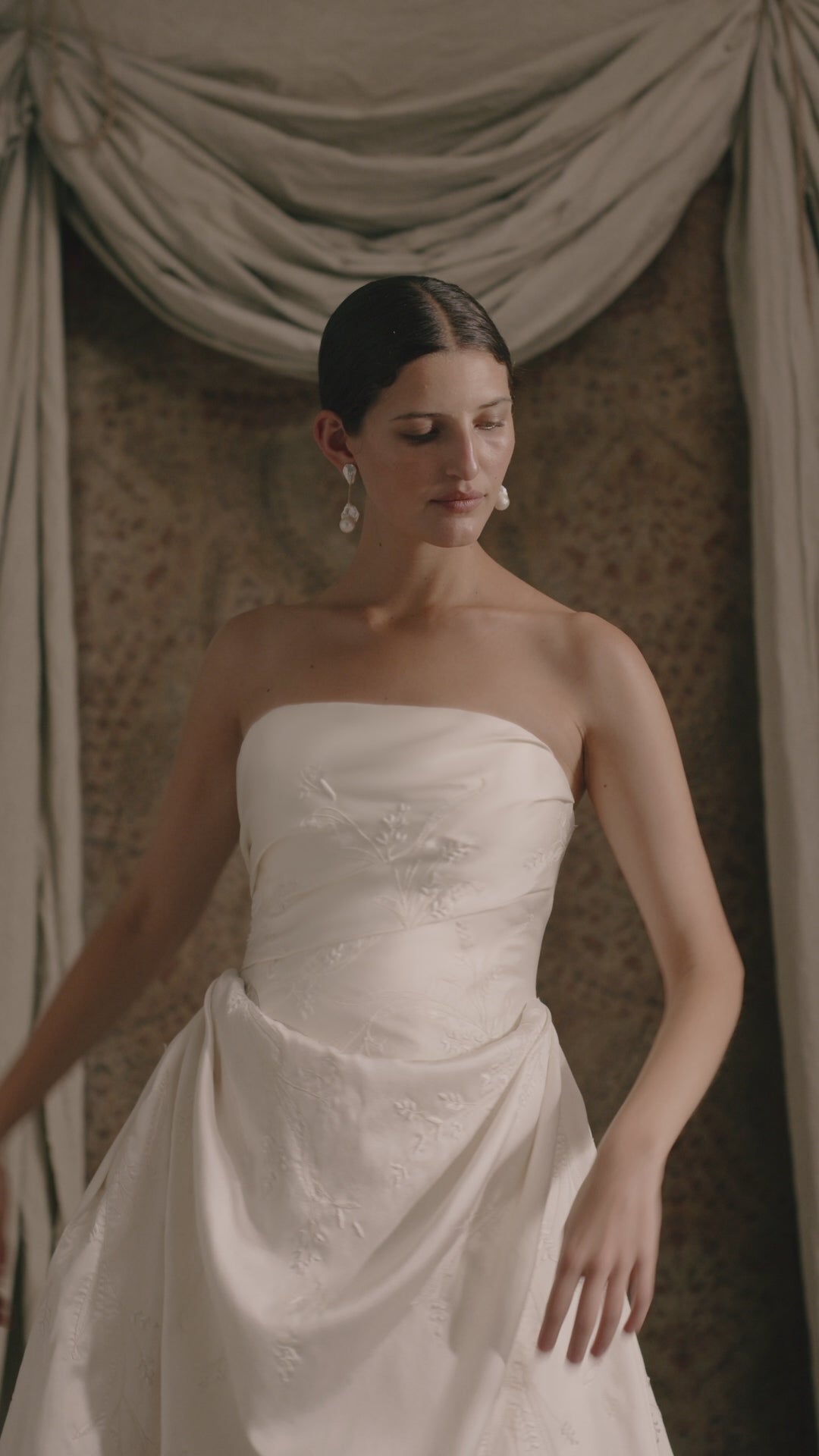 An architectural reverie in silk and light, Petra sculpts the body with precision before dissolving into fluid movement. Intricate hand embellishment catches the light beneath soft layers, creating a couture bridal gown that feels both powerful and deeply romantic.