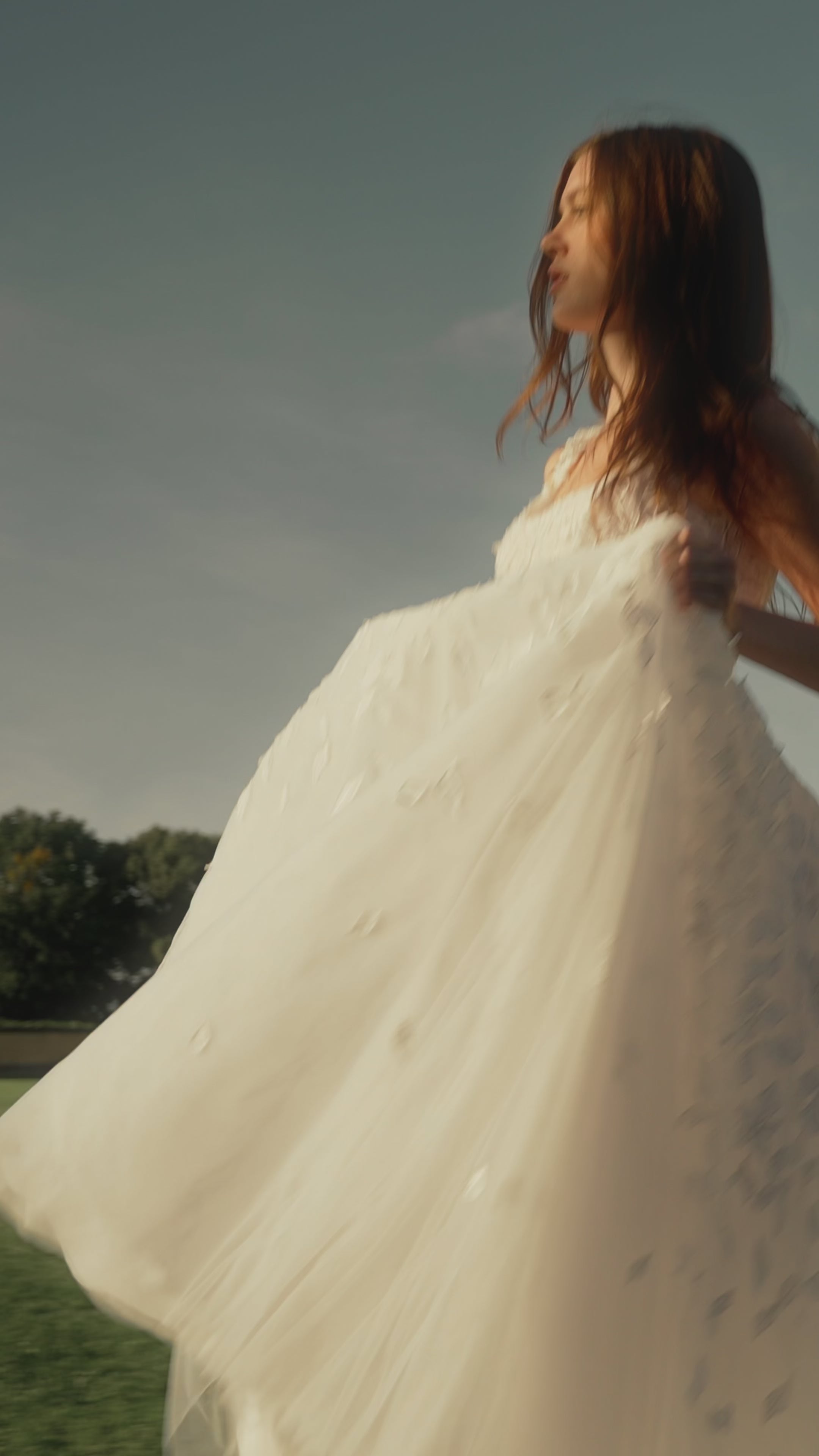 Both enchanting and unique, this style is a perfect blend of classic elegance and contemporary creativity. The square neckline is defined by clean, crisp lines that frame the bride's collarbone and shoulders, giving the dress a timeless yet contemporary appeal. The dress is primarily crafted from delicate tulle fabric, known for its ethereal and airy quality. As the bride moves, the tulle gently floats, creating a sense of enchantment with every step. One of the most distinctive features of this dress is the intricate puzzle piece details, artfully designed from chiffon. Each piece is carefully handcrafted, creating a beautiful and subtle mosaic-like pattern that adorns the tulle.