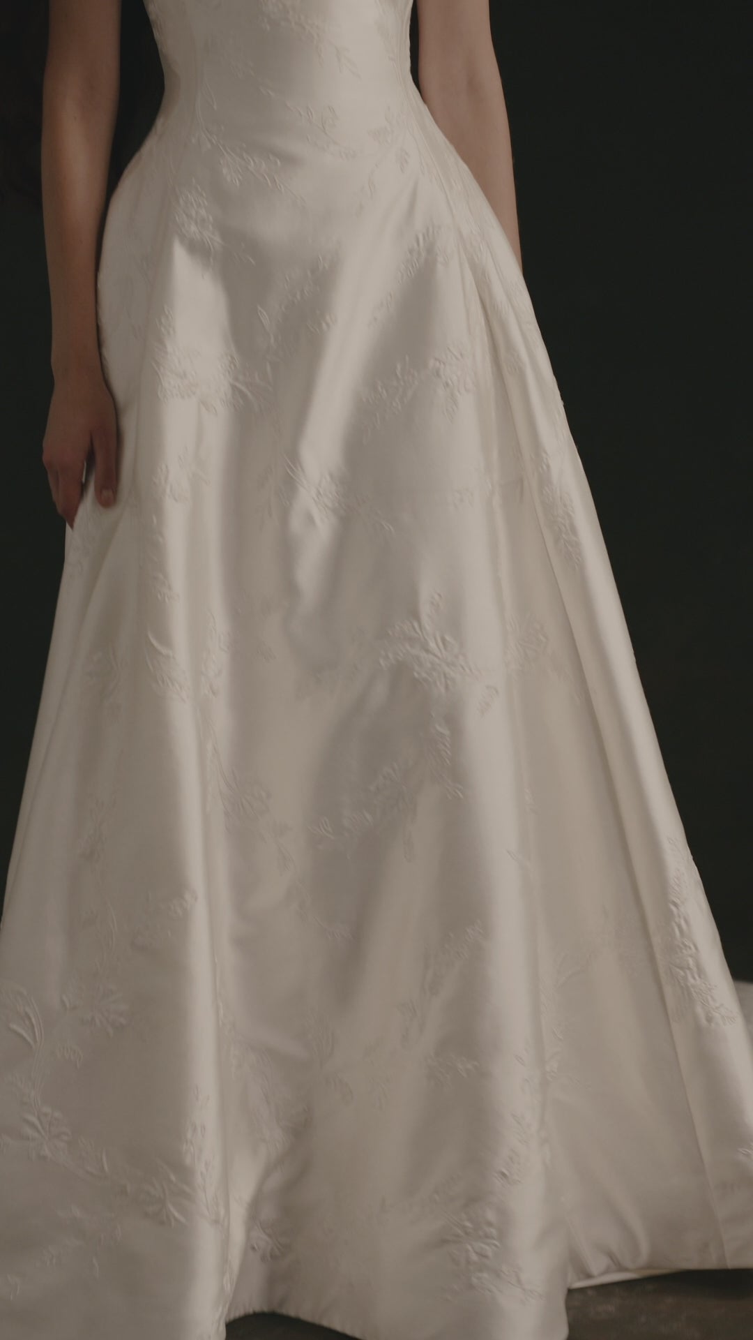 Sierra is a couture wedding gown defined by its elongated silhouette and refined hand detailing. Clean lines and subtle embellishment create a look that feels modern, fluid, and timelessly elegant.