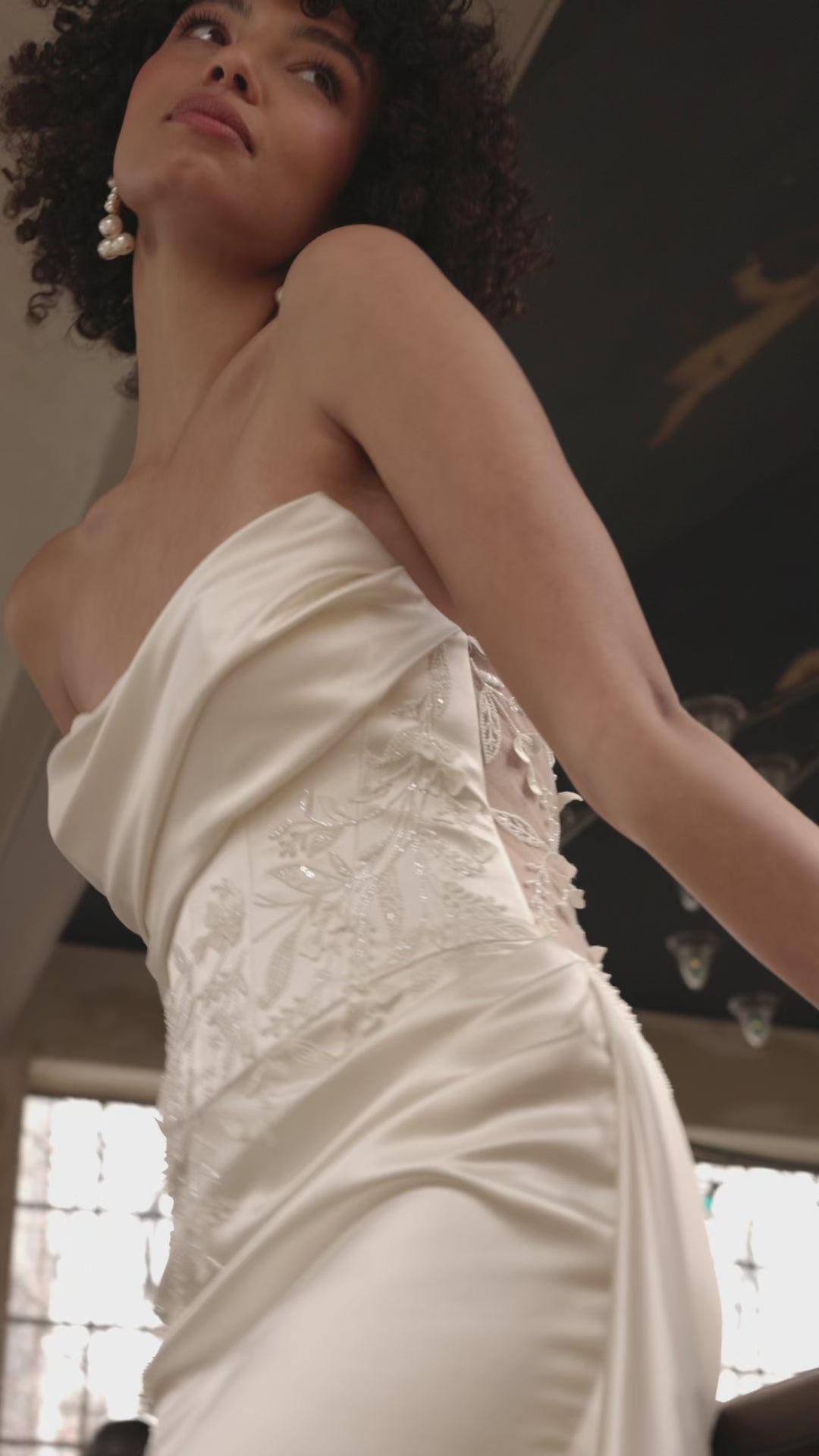 This strapless, asymmetrically draped neckline wedding dress is a stunning and sophisticated choice for a bride who wants to make a bold and beautiful statement on her special day. The satin back crepe drapery flows from one side to the other, creating a dynamic and asymmetrical effect that is both modern and elegant. The dress features elegant floral hand-beaded embroidery that flows alongside the drapery and continues onto the skirt. The intricate embroidery adds a delicate and feminine touch to the dress, creating a sense of romance and luxury. The skirt is designed with the same drapery as the neckline, creating a sense of unity and cohesion in the overall design. The back bodice of the dress features a unique asymmetrical lapel, adding an unexpected and interesting element to the design. The lapel is designed to mirror the asymmetric drapery of the neckline, creating a harmonious look.
