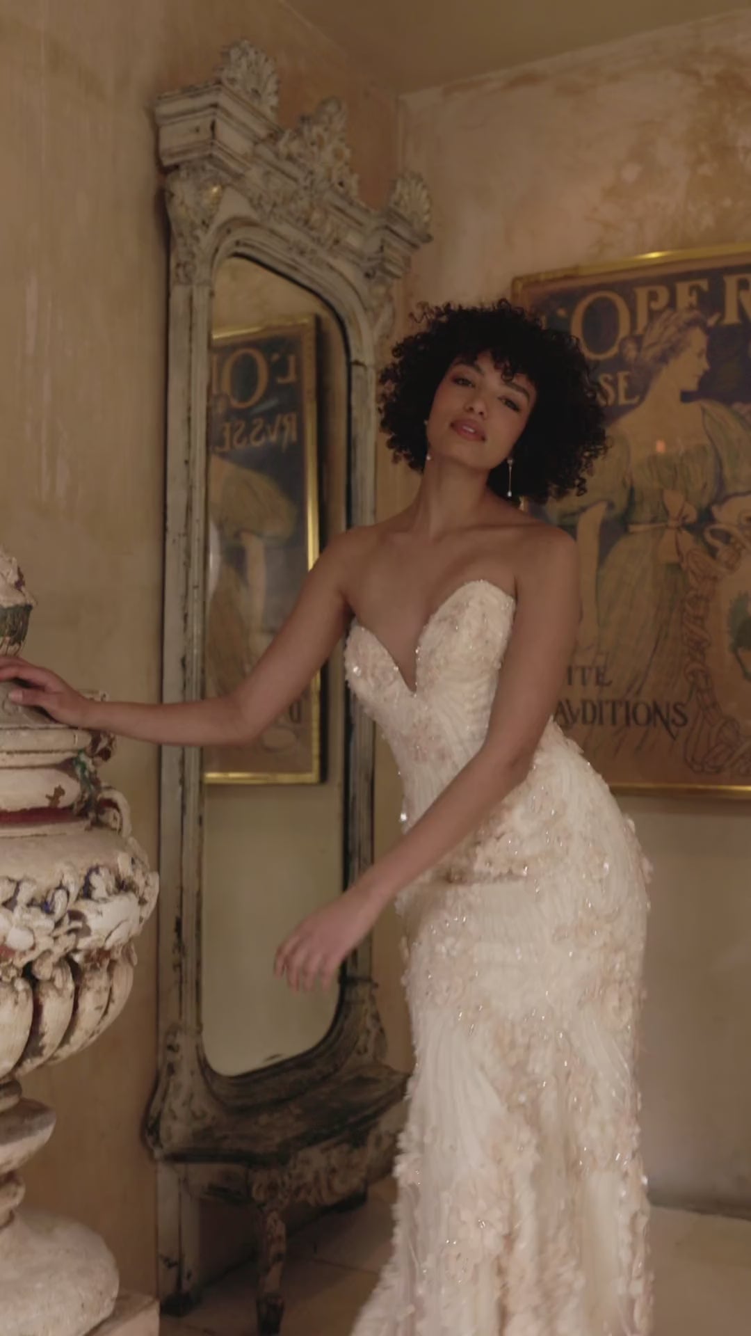 Designed to accentuate the curves of the body, with a close fit around the hips and waistline, this gown is made for a bride who wants to make a statement on her special day. The strapless round sweetheart neckline frames the face and shoulders beautifully, creating an elegant and feminine look. The dress features intricate, hand-cut satin face organza florals that are layered to create a 3-D texture, adding depth and dimension to the overall design. The florals are arranged in a cascading pattern, starting at the neckline and flowing down the length of the dress, creating a sense of movement and fluidity.